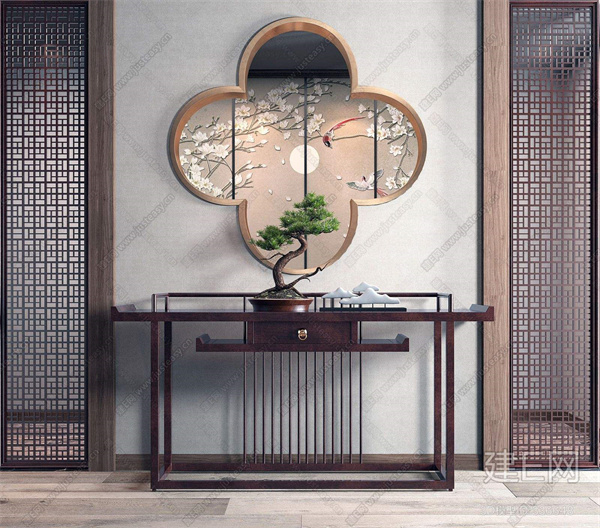 新中式家具总体布局对称均衡,稳健端正,在装饰细节上崇尚自然情趣,花鸟山水,富于变化。